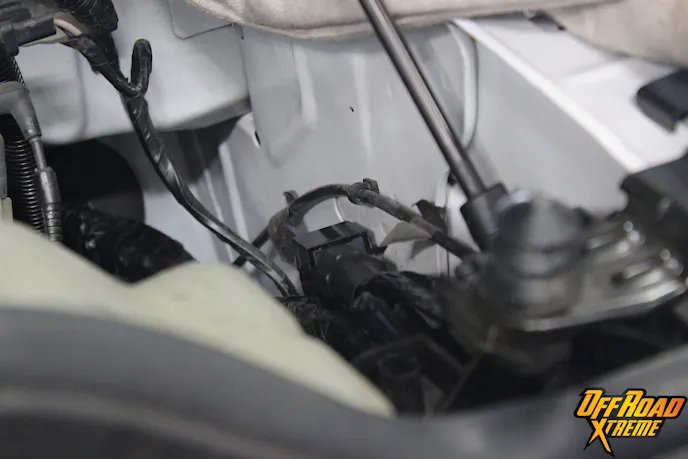 The included wiring harness has a very simple layout with one section that runs to the battery, one that runs to the light bar, one that runs to an included relay, and one that runs to the interior switch. We first ran the interior switch wire which was fed through the steering column opening in the firewall and connected to the switch. Now that the switch was wired, we reinstalled the dimmer-switch plate along with the left side panel of the dash and then turned our attention to the engine bay.