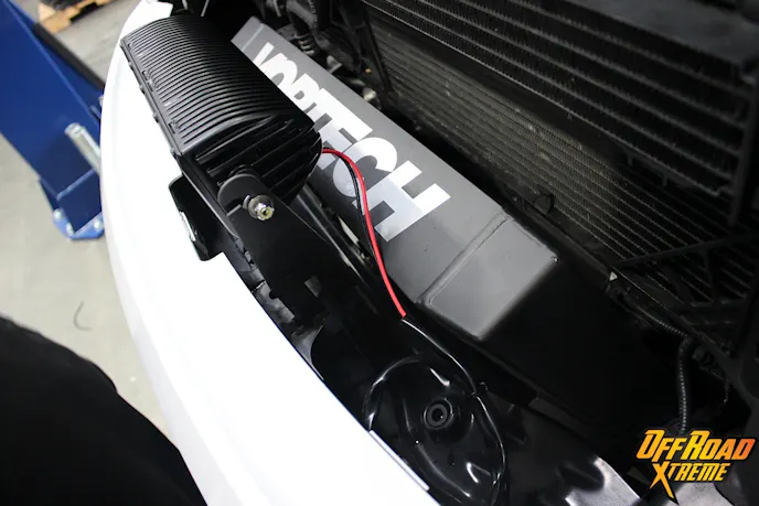 The final step was to find the best routing of the light bar wires so that they would not interfere with anything else in the engine bay. Once our route was selected, we attached them to the light bar. Now that the entire install was done, we followed each of the kit’s wires to make sure that they were secure and wouldn’t rub on anything causing them to wear through. After a quick once over, a simple flip of the dash-mounted switch and our 10-inch Rigid Industries light bar came to life!
