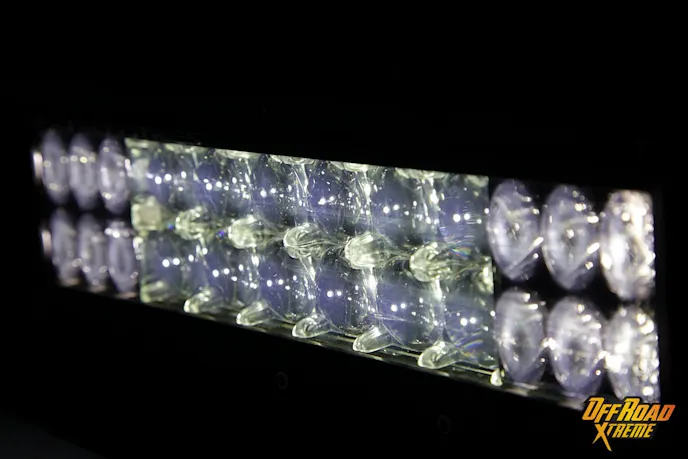 Looking at the light bar, you will notice that there are two distinctly different sets of optics on the “combo” style light bar. In the center section, we have Rigid’s Hyperspot five-degree ultra-narrow spot beam for providing lighting at a long distance. The Hyperspot has a more concentrated beam that projects outward and will allow drivers to see farther out in front of them with a more narrow field of light.