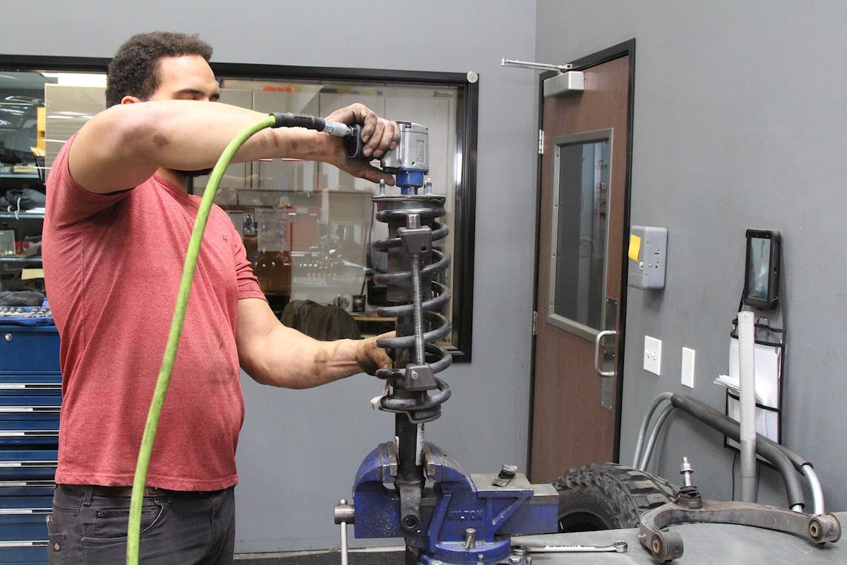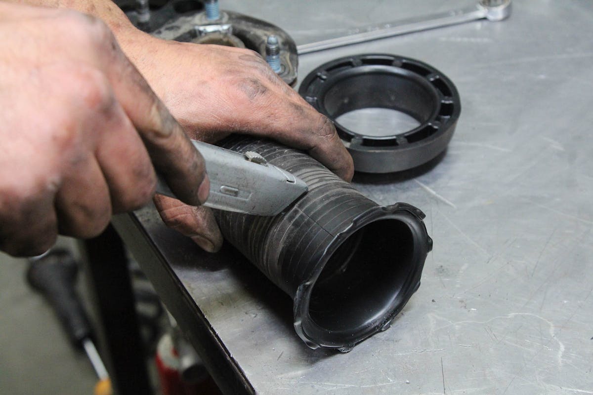 The instructions called for us to reuse the dust boots on the stock shocks. We used a vise to clamp the assembly in place, and then employed spring compressors to push down on the spring and free up the nut holding the assembly together. With that done, we removed the dust boot and made a cut about an inch down from its top.