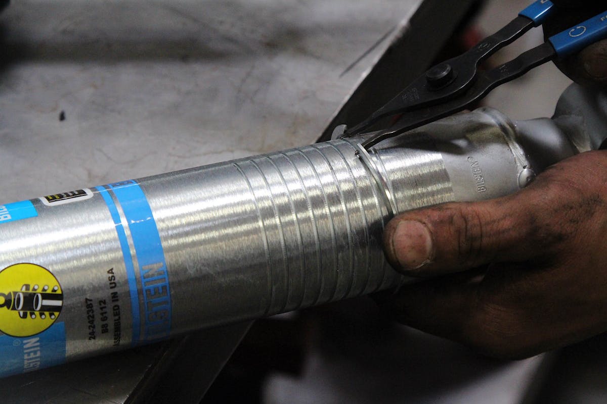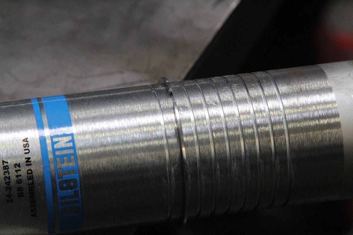 We stopped working on the stock front suspension for now and turned our attention to the Bilstein shocks. It was time to adjust the overall height using the snap ring and grooves milled into the struts exterior. We wanted to raise the front to equate with the old setup. According to the provided chart, this meant moving the snap ring up to the penultimate groove, equating to about three inches of lift.