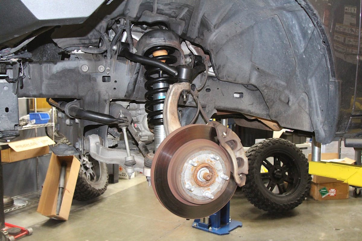 We took the completed Bilstein struts and installed them into the truck. We paired them up with new Rough Country tubular control arms. These aftermarket control arms were a nice upgrade to compliment the new, wider Bilstein struts and springs. We wrapped up installing the arms and struts and made sure everything was torqued to spec before reinstalling the tires and moving on to the test.