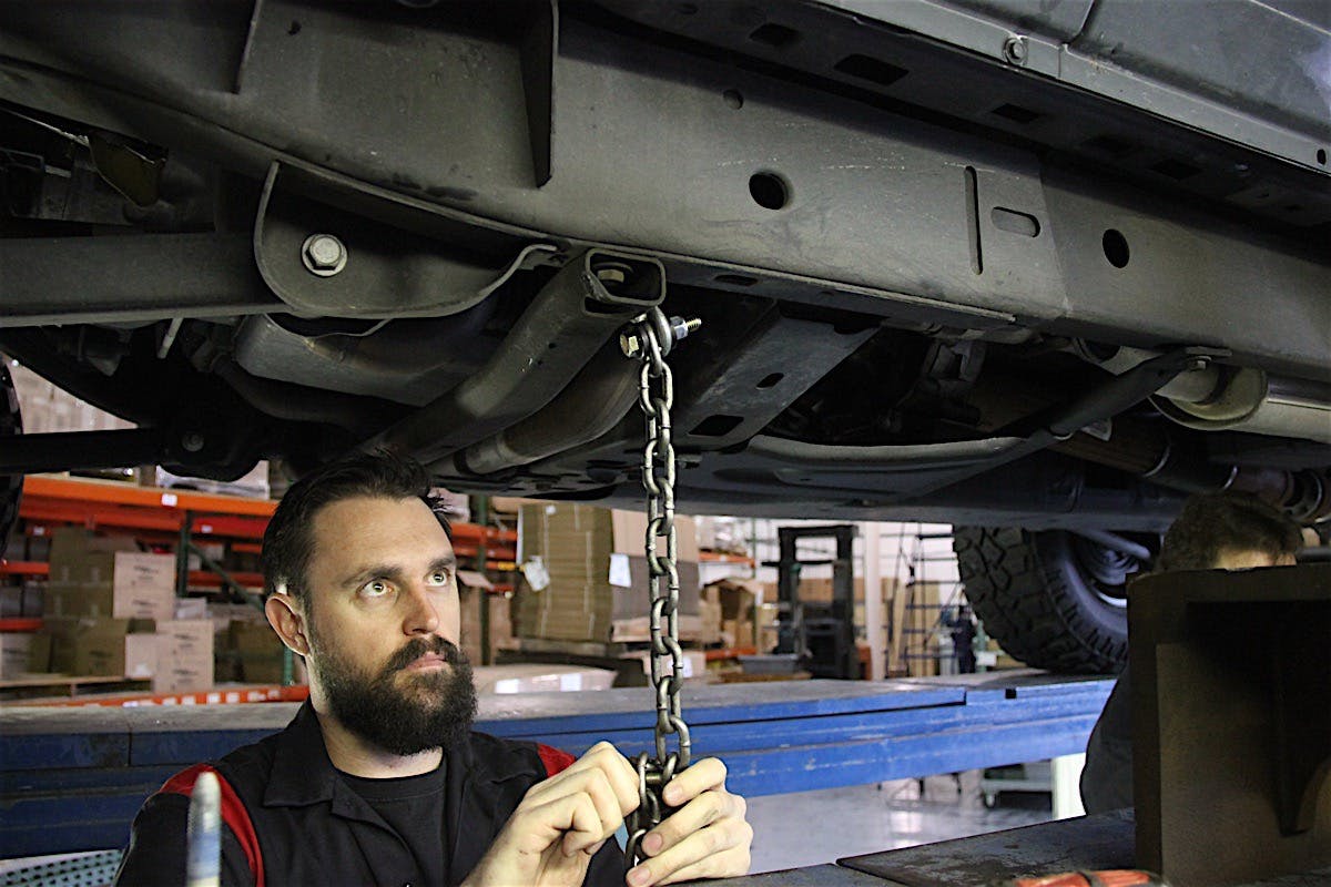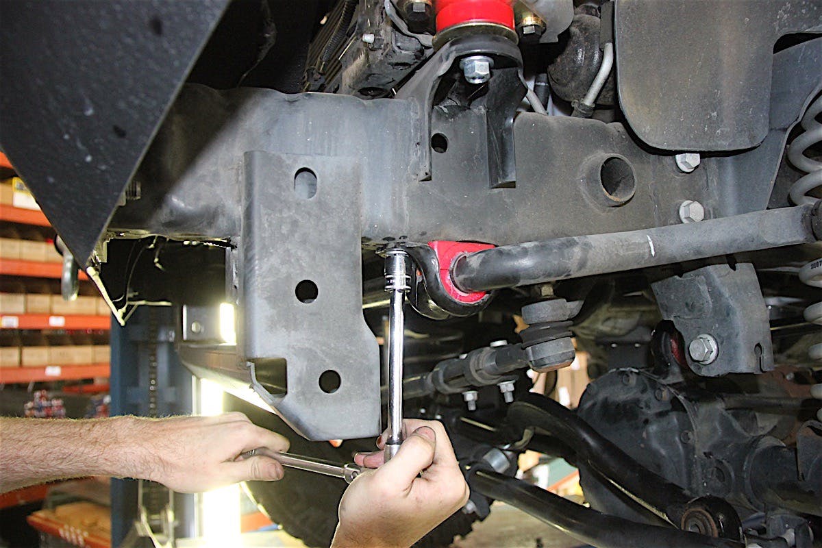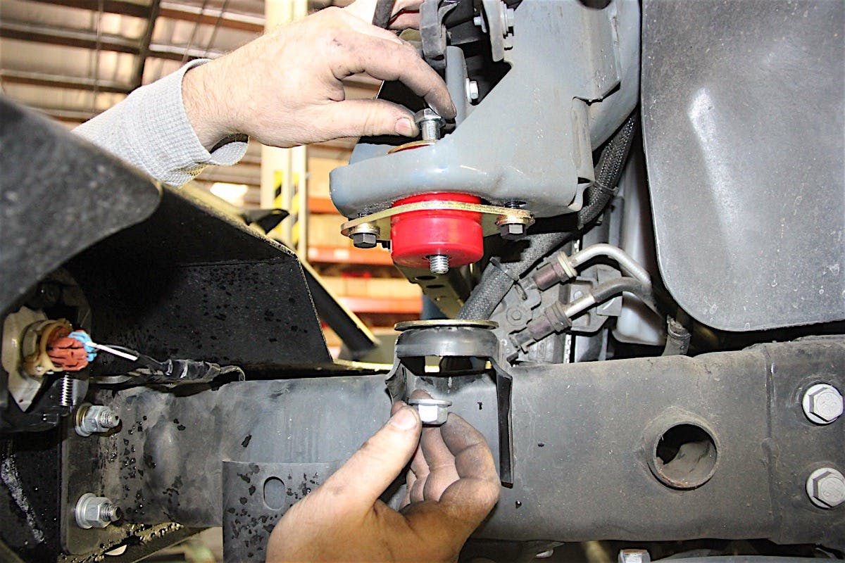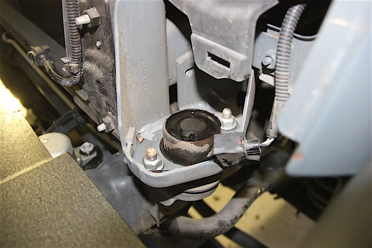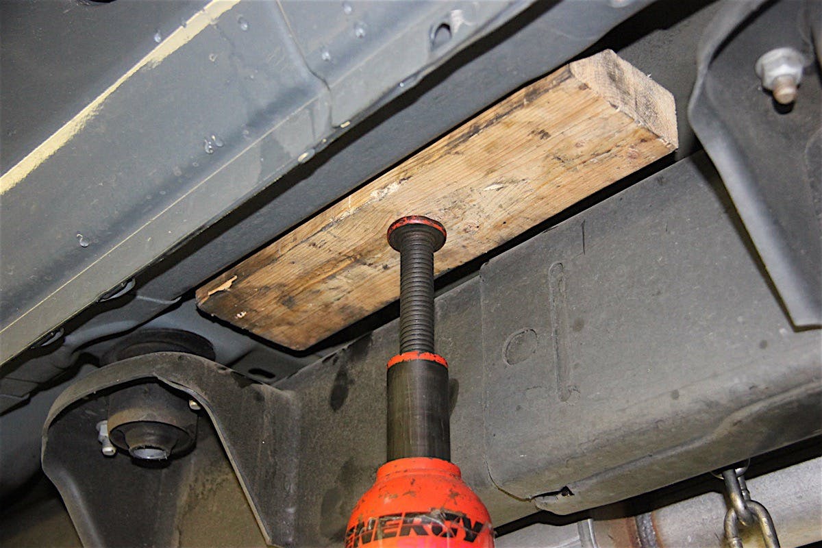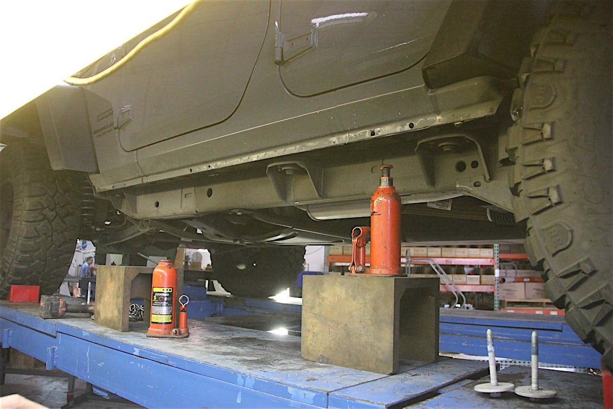 As a matter of fact, the body mounts were the first items that we tackled in our installation. With the Jeep parked and chocked on a four-post lift, we took chains with hooks and went to work on the left side of the vehicle. The chains and hooks connected the frame to the lift, while five-ton bottle jacks were deployed strategically and the bolts on the right side of the vehicle were loosened to give us enough play to tilt the vehicle up and to the right. The jacks lifted (using wooden blocks to help disperse the load) the body from the frame, allowing us to gain access to the body mounts.