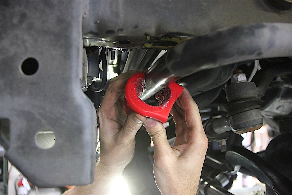 Installing bushings on the sway bars was relatively painless, as these only had a few bolts holding us back from freeing them up. The hardest part was taking a box cutter and hacking through the bushing, which we did in a few seconds. The Energy Suspension bushing went on simply, and that was thanks to a pre-made incision that allowed us to slip it over the sway bar and into place.