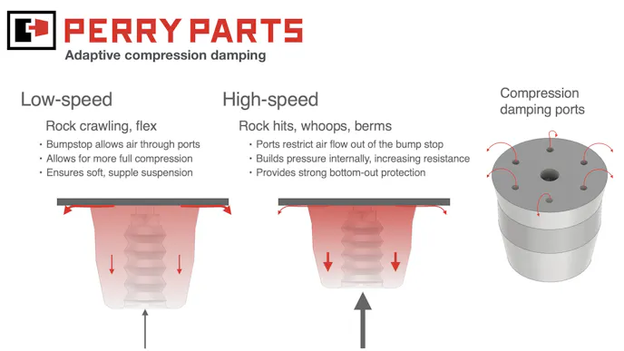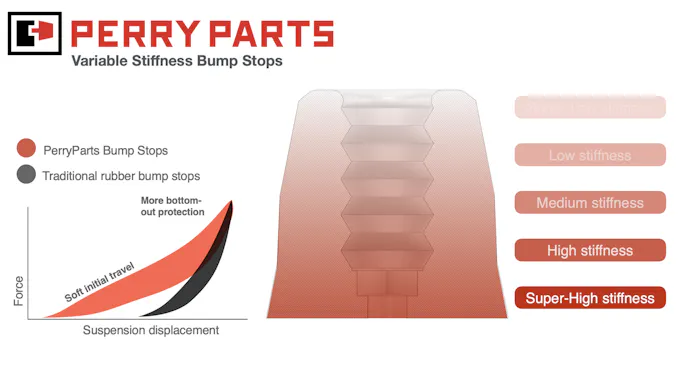 Today, Perry Parts has created over 30 product designs. Along the way, the company has created a new manufacturing process that is a first in the bumpstop world. Additionally, they have established a new standard for testing these types of products. Perry Parts says it has tuned its bumpstops dozens of times using its in-house suspension dyno. The result is improved ride feel, progression, size, shape, and durability.