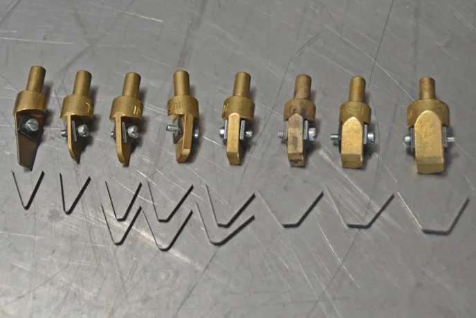 The depth of the cut is controlled by the adjustable blade. The brass heads and razor-sharp blades are available in nine different widths. Blades also come in five different strengths and a variety of tip shapes.