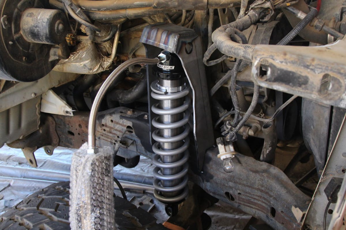 Things were moving along. Damage Inc was in the process of cycling the suspension on all four corners. “We want to see how much shock travel we can achieve once we have clearance,” said Damage Inc’s Tyler Mitchell. “On the front of the truck, we’re pulling stuff apart so we can get the shock towers set up. We’re going to need to build radius arms that connect to the I-beams, and we need enough clearance for the 37-inch Toyo tires.”