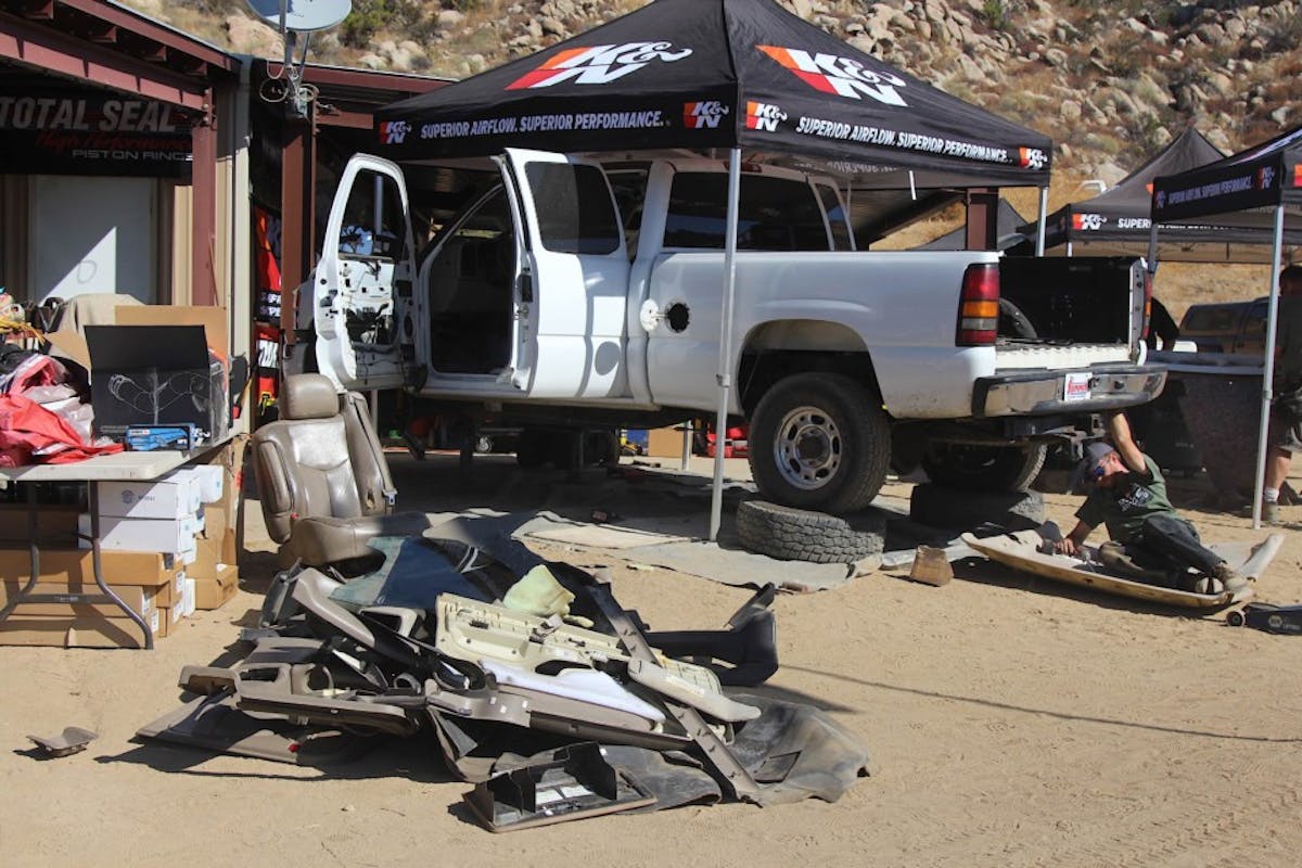 Team Damage explained that they were going to take off the F-250’s bed and remove the front suspension to mock up the shocks, as well as remove the auxiliary fuel tank and rear axle. Team RSO already had its bed removed and was taking on the interior, stripping it of everything, down to the last bolt holding the seatbelts to the floor of the ’96 Dodge Ram 1500. Team RaceAnything put their ’04 GMC 2500HD on jack stands and removed the front wheels, while Orie Harmon took on gutting the cabin. Team Nexgen was working on its bedless F-150 and taking care of the cabin and front suspension removal.