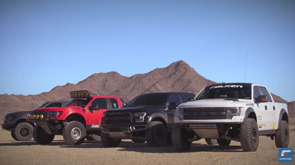 Two first generation Raptors with some light modifications, another first generation with very heavy modification (basically a full race truck), and one completely stock second generation. Each truck and its associated modifications showcased the tire in a different way.