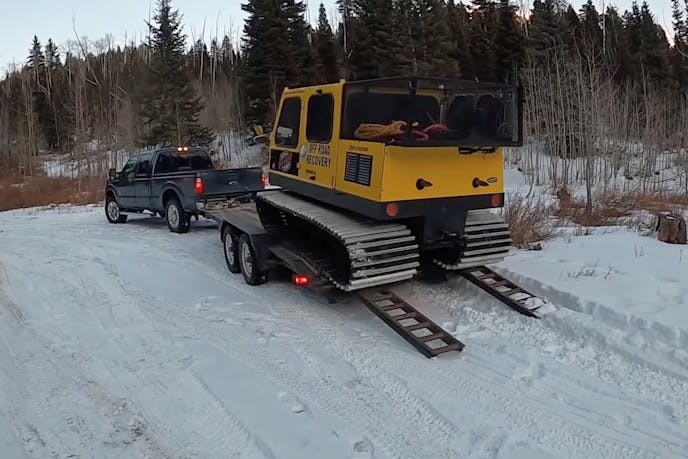 The setup for the video is a Jeep Wrangler JK that got stuck up in some mountains. Matt is towing a Snow Cat behind his Super Duty, and the former will be the star of the show once the time comes to hoist the Jeep to freedom.