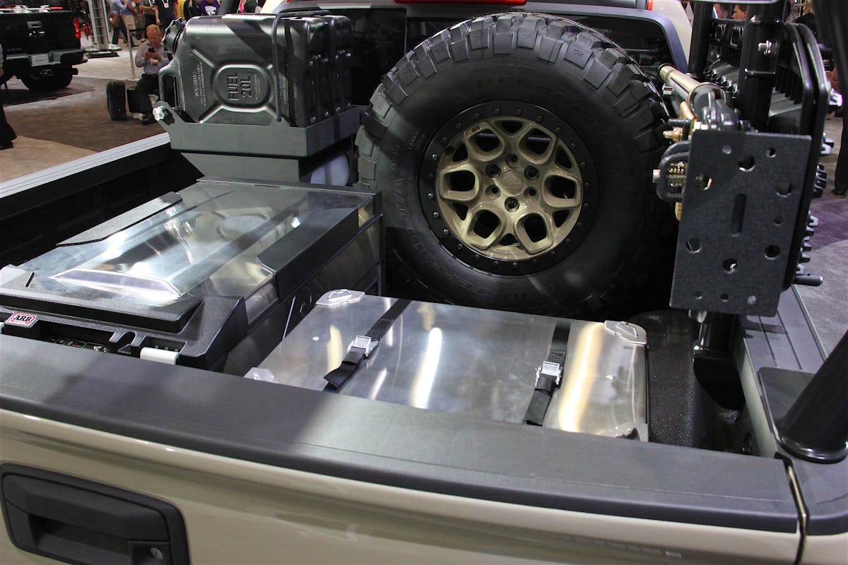 The ZR2 AEV concept has plenty of add-ons which include AEV front and rear off-road bumpers, complete underbody skid protection, expedition bed rack, high clearance fender flares and high-rise snorkel, AEV DualSport beadlock wheels, 35-inch BF Goodrich KM2 Mud-Terrain tires, front and rear high output LED auxiliary lighting, ARB refrigerator/freezer, Equipt aluminum storage cases, NATO-style fuel cans and James Baroud USA awning in the bed