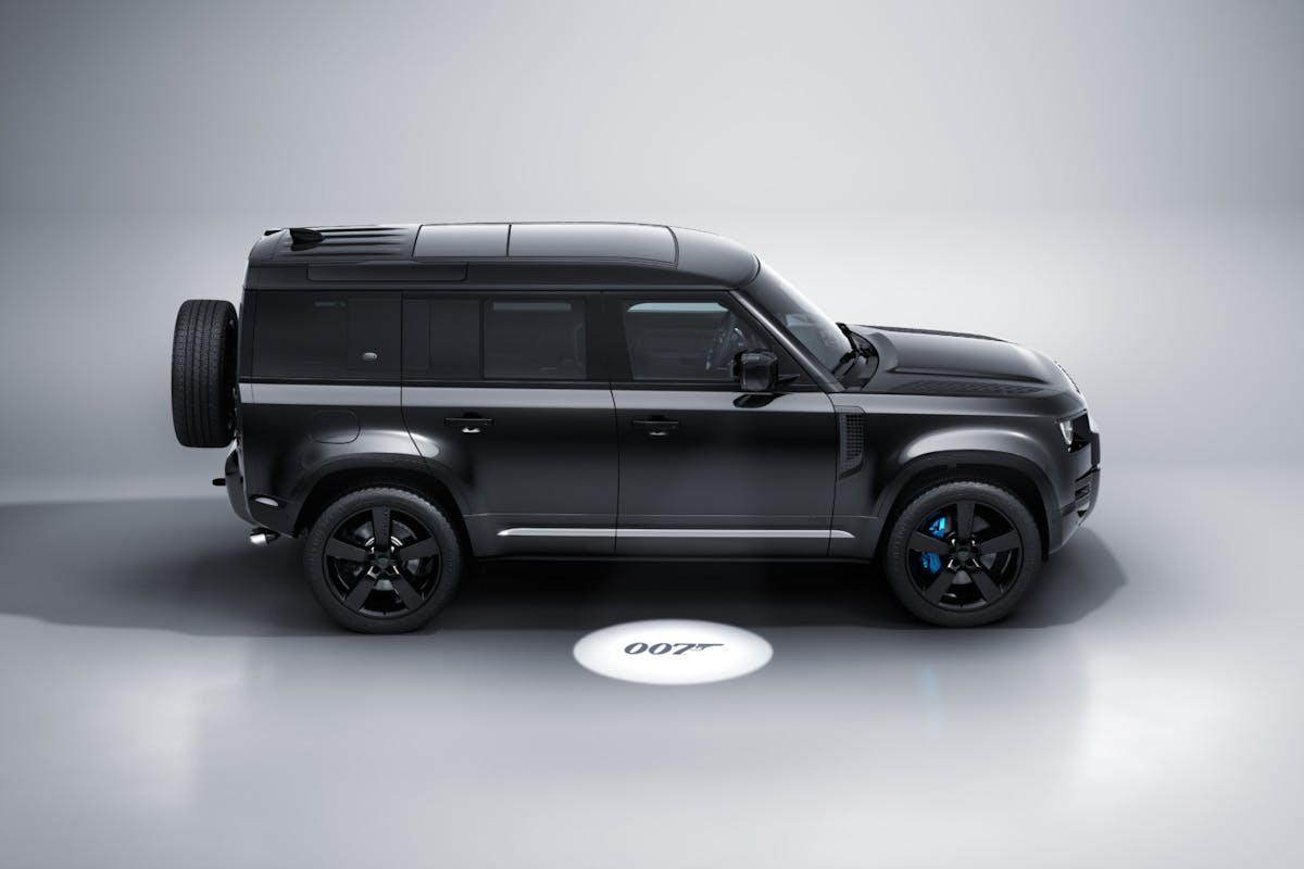 Open the doors and you’ll see an illuminated “Defender 007” treadplate and the puddle lamps illuminating the ground with the classic “007” logos.