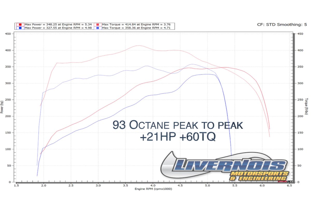 Livernois ran a baseline pull and then followed it up with their custom tune on 87 octane gas. Power increases included 9 horsepower and 30 pound-feet of torque peak to peak. When checking the graph, the middle numbers are where the big gains occurred. An increase of 30 horsepower and 40 pound-feet can be found there. On the 93 octane tune, there is an increase of 21 horsepower and 60 pound-feet of torque peak to peak. Millen remarked, “That’s something you’re really going to feel. The really big story here is what it did in the middle. It picked up 45 horsepower in the middle on 93 octane.” Stay tuned to Livernois Motorsports’ Facebook as they continue to develop additional towing tunes as well as Flex Fuel tunes for this beast.